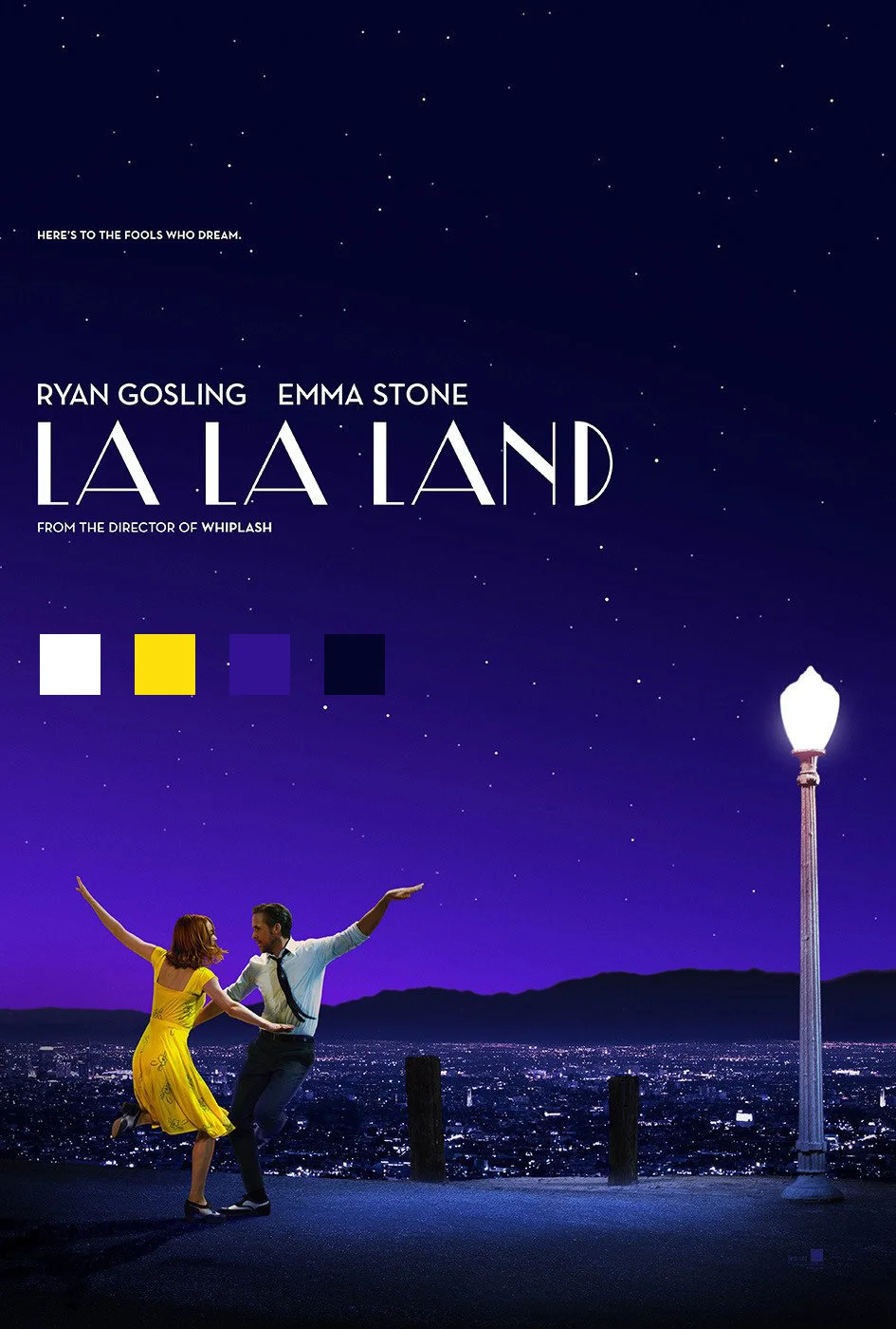 The title of the film is big and clear. The two letter “LA” is highlighted three times, as this is a story in LA, a city for dreamers. The second important information is name of the lead actors. Then, it says “from the director of Whiplash,” indicating if you like Whiplash, you would probably like this one too.